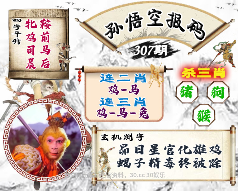 | 307期:复式连肖 复式连肖:[鸡羊猴]-[猪狗牛]-[马虎鼠] |